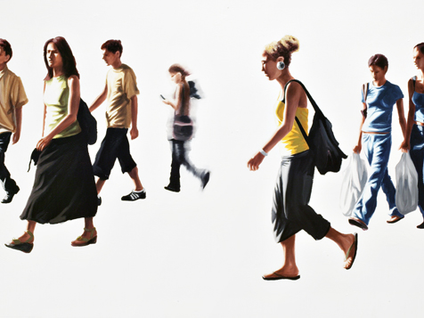 (...) Ovviamente nulla è casuale nella costruzione dell’immagine. Hanno un preciso senso gli incroci di sguardi, le distanze e vicinanze, le tipologie d’abbigliamento, gli accessori in maggiore o minore evidenza. I quadri si calibrano attorno al numero di protagonisti in campo. Hanno chiare valenze le quantità di bianco, gli incastri prospettici, l’uso costante di un orizzonte frontale che scorre da sinistra a destra (sia per linee rette che in diagonale) e viceversa. Alla fine vince un risultato dai toni omogenei in cui devi indagare le corde invisibili che legano le persone. E poi contano gli stessi sguardi, bisogna osservare gli occhi e le posture del volto. Alcuni camminano piano, altri corrono, qualcuno attende qualcosa, diverse figure osservano e sembrano porsi una domanda. Non sapremo mai cosa pensano ma possiamo trasferirli nel nostro passeggiare urbano, quando attraversiamo le strade e guardiamo gli sconosciuti: immaginando le loro vite, le passioni e i dolori che sanno nascondere, i desideri e il disincanto che si portano dentro, le mille stranezze private. Domandandoci, subito dopo, quali e quante cose ci legano senza saperlo.